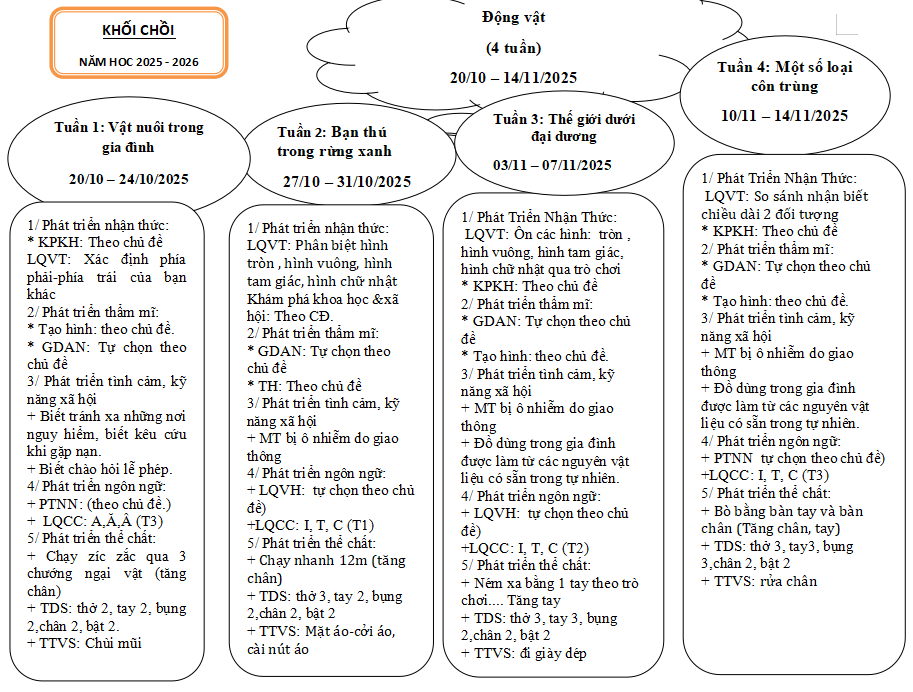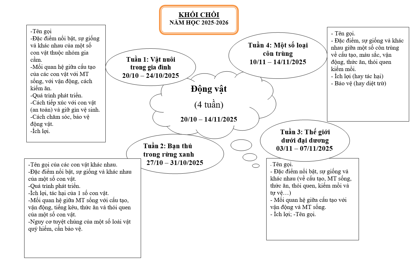 Mạng nội dung là bản khái quát những nội dung trọng tâm trong chủ đề “Động vật”, thể hiện rõ trẻ cần được tìm hiểu, khám phá về các con vật gần gũi trong môi trường sống như vật nuôi trong gia đình, động vật rừng, động vật dưới nước, côn trùng… Qua đó, trẻ hiểu đặc điểm, lợi ích và cách chăm sóc, bảo vệ các loài vật, hình thành tình yêu thiên nhiên và ý thức bảo vệ môi trường sống.