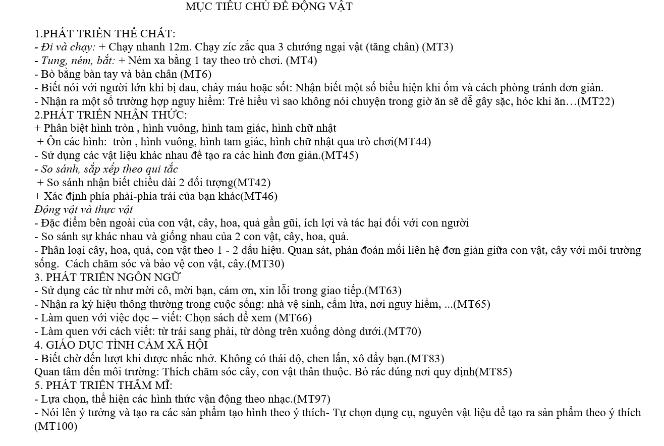 Mục tiêu của chủ đề “Động vật” giúp xác định rõ kết quả mong đợi sau khi trẻ tham gia các hoạt động. Trẻ nhận biết được tên gọi, đặc điểm, lợi ích và nơi sống của một số con vật quen thuộc; biết yêu quý, chăm sóc, bảo vệ động vật; hứng thú tham gia các hoạt động khám phá, nghệ thuật, vận động liên quan đến động vật, góp phần hình thành tình yêu thiên nhiên và thái độ tích cực đối với thế giới xung quanh.
