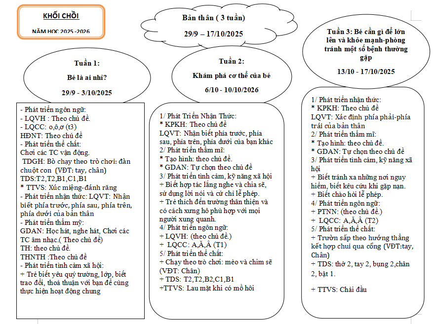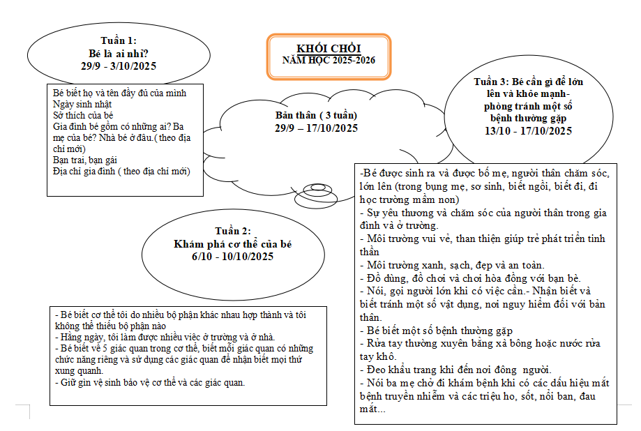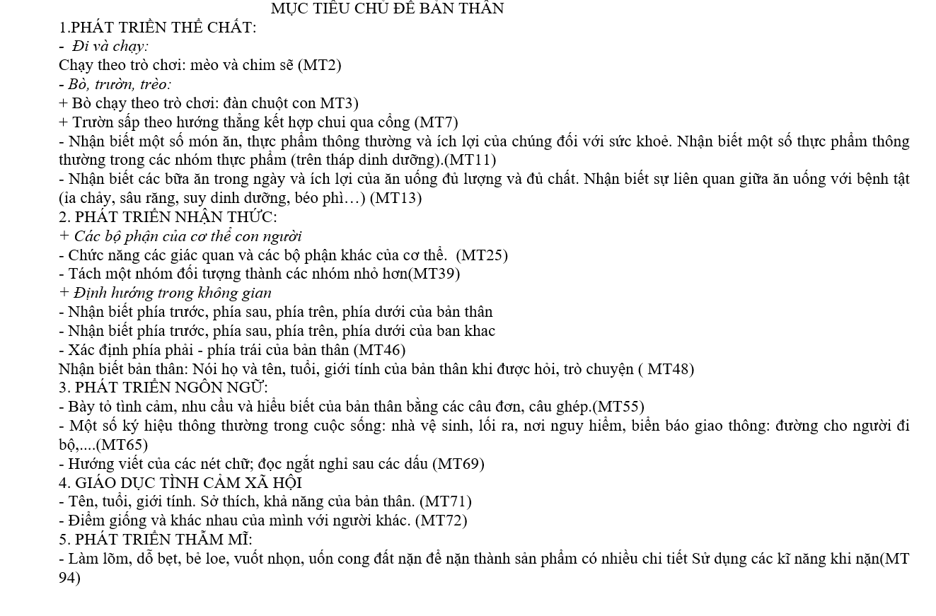 Mục tiêu của chủ đề “Bản thân” giúp xác định rõ kết quả mong đợi sau khi trẻ tham gia các hoạt động. Trẻ biết yêu quý, chăm sóc cơ thể, nhận biết cảm xúc, tự tin thể hiện bản thân, biết quan tâm đến người khác và hứng thú tham gia vào các hoạt động học tập, nghệ thuật, vận động, góp phần hình thành nhân cách và kỹ năng sống ban đầu.